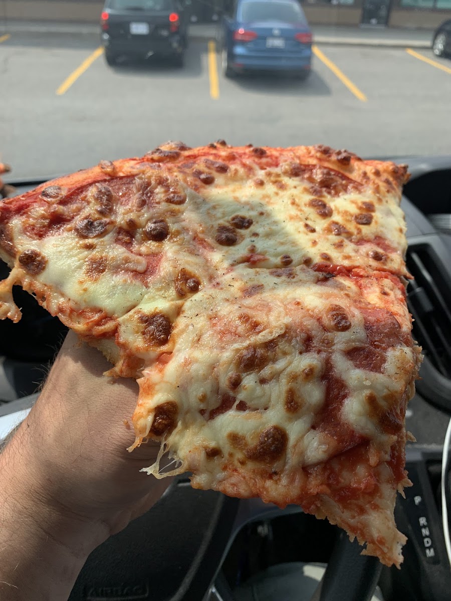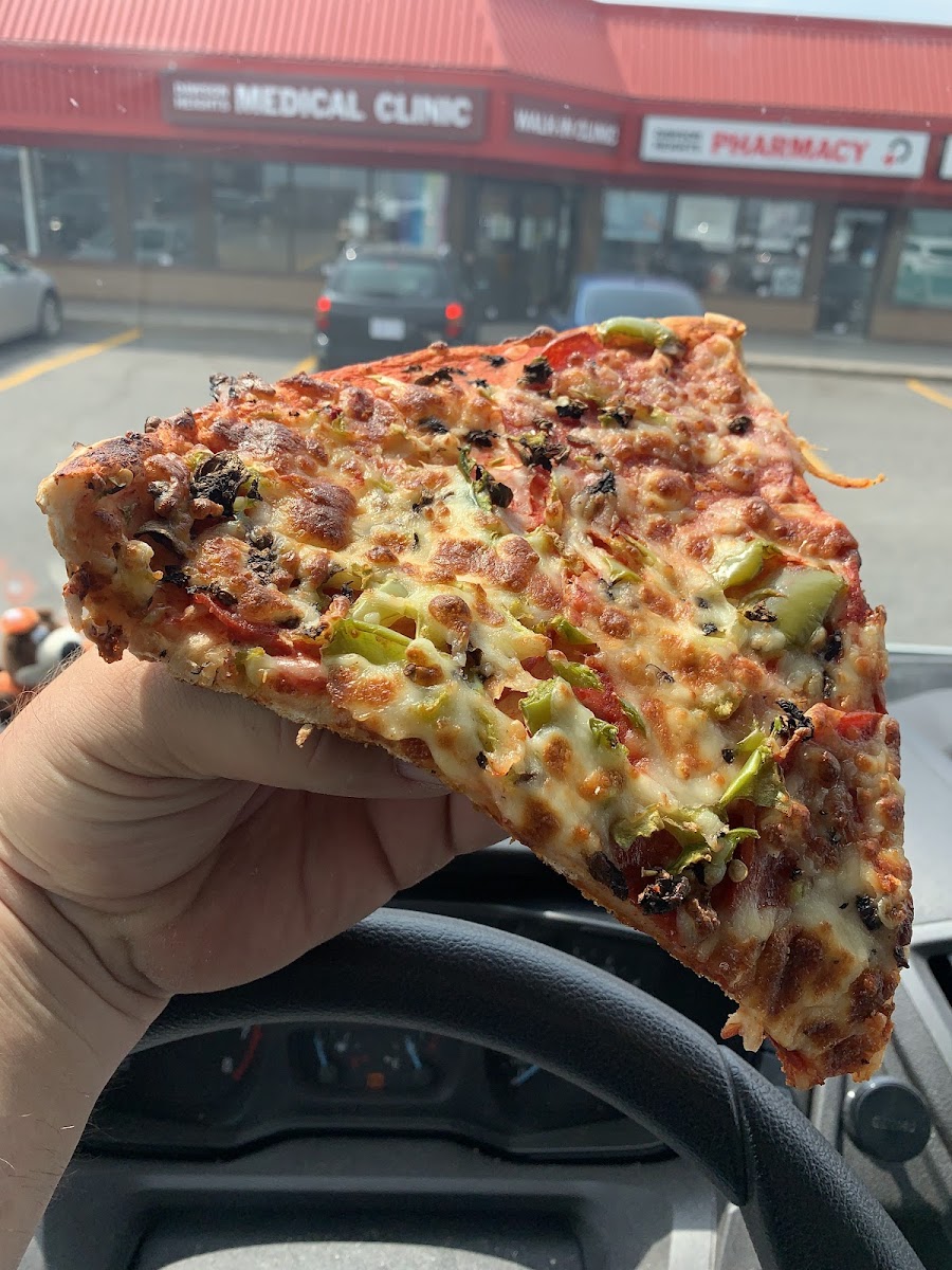 Really good quality pizza for good price. Thin crust with plenty of toppings, they out the toppings under the cheese instead of over. They also do slices which are large and 2 for $10 w a free pop. There are a couple tables in case you want to sit and eat or need to wait. There is plenty of parking.